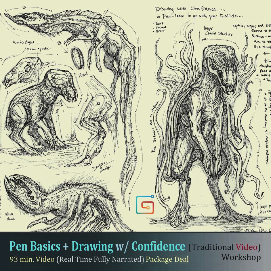 Basics of Sketching in Pen + Drawing w/ Confidence: Creature Design (Real Time Video) Package deal. Save $1